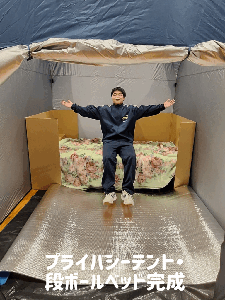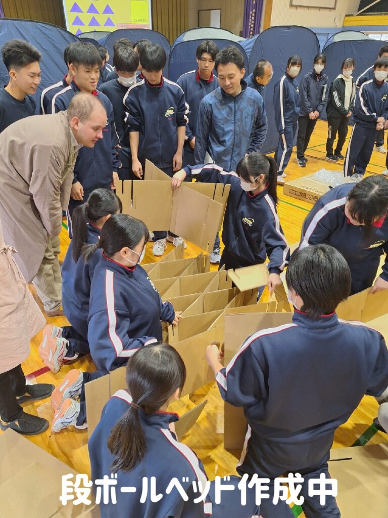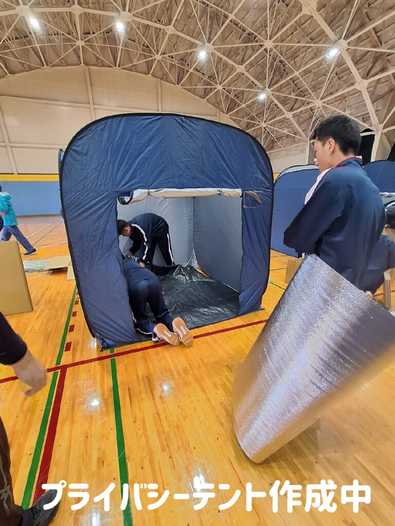 全校生徒のみなさんがプライバシーテントや段ボールベッドの組立てを体験し、