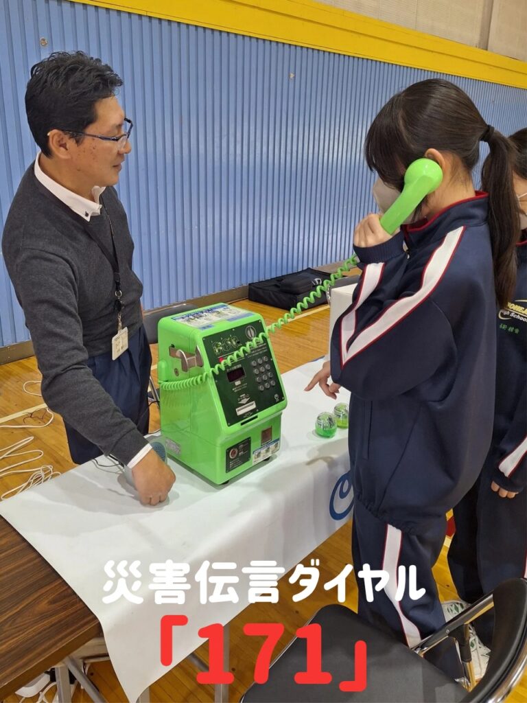公衆電話を使って「災害伝言ダイヤル171」 を体験したり、