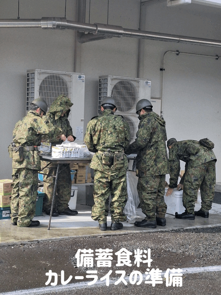 備蓄食料の野菜カレーやアルファ米を参加者と高校生、野村町長も一緒に試食。(温めずに食べられる野菜カレー、水やお湯を注ぐだけでできるアルファ米)