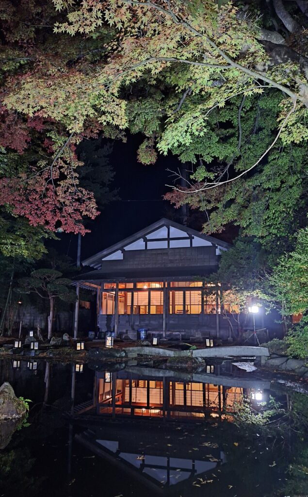ライトアップされた行在所と、その姿を映す庭園の池がしっとりと美しく輝いていました。