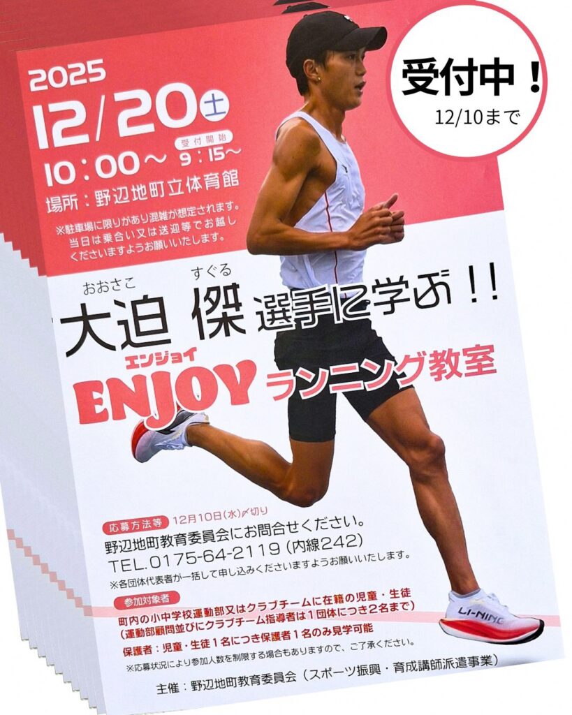 野辺地町で、元日本マラソン記録保持者・東京オリンピック6位の『大迫 傑(おおさこ すぐる)選手』がランニング教室を開催します。