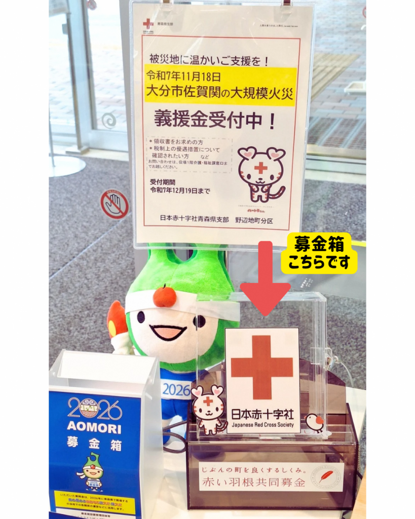 野辺地町文区では、野辺地町役場正面玄関を入って左側 に募金箱を設置しています。