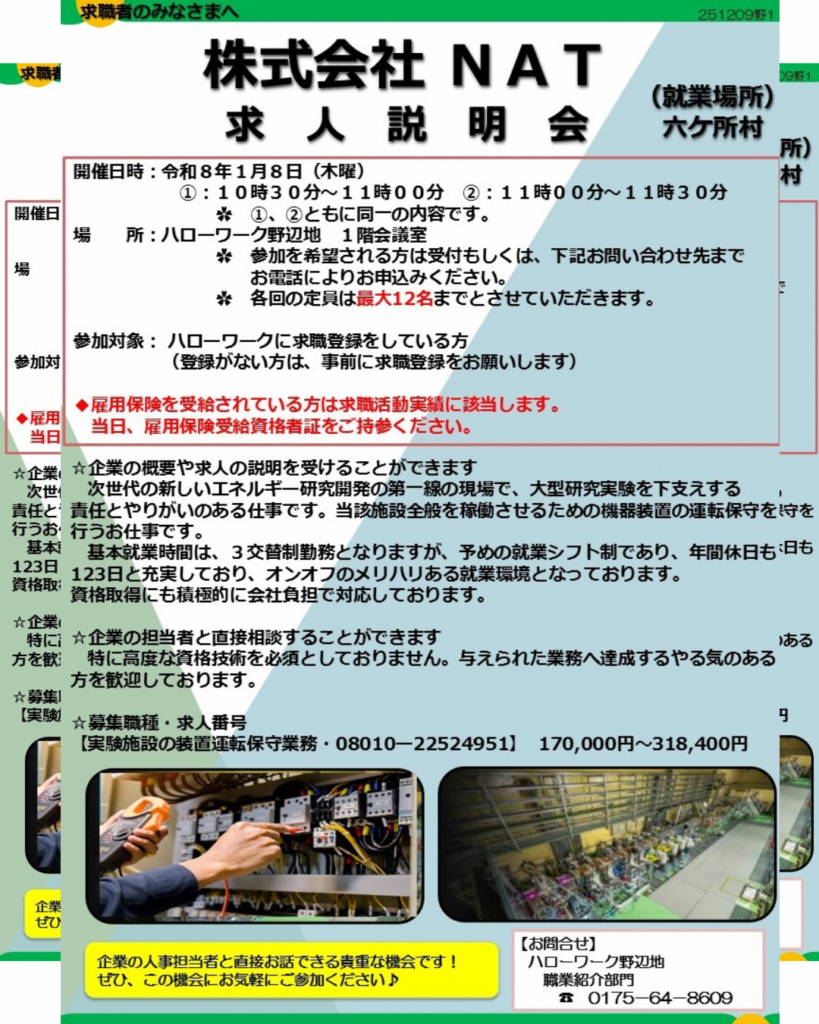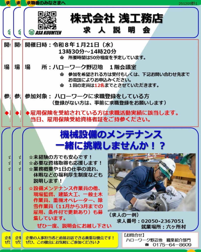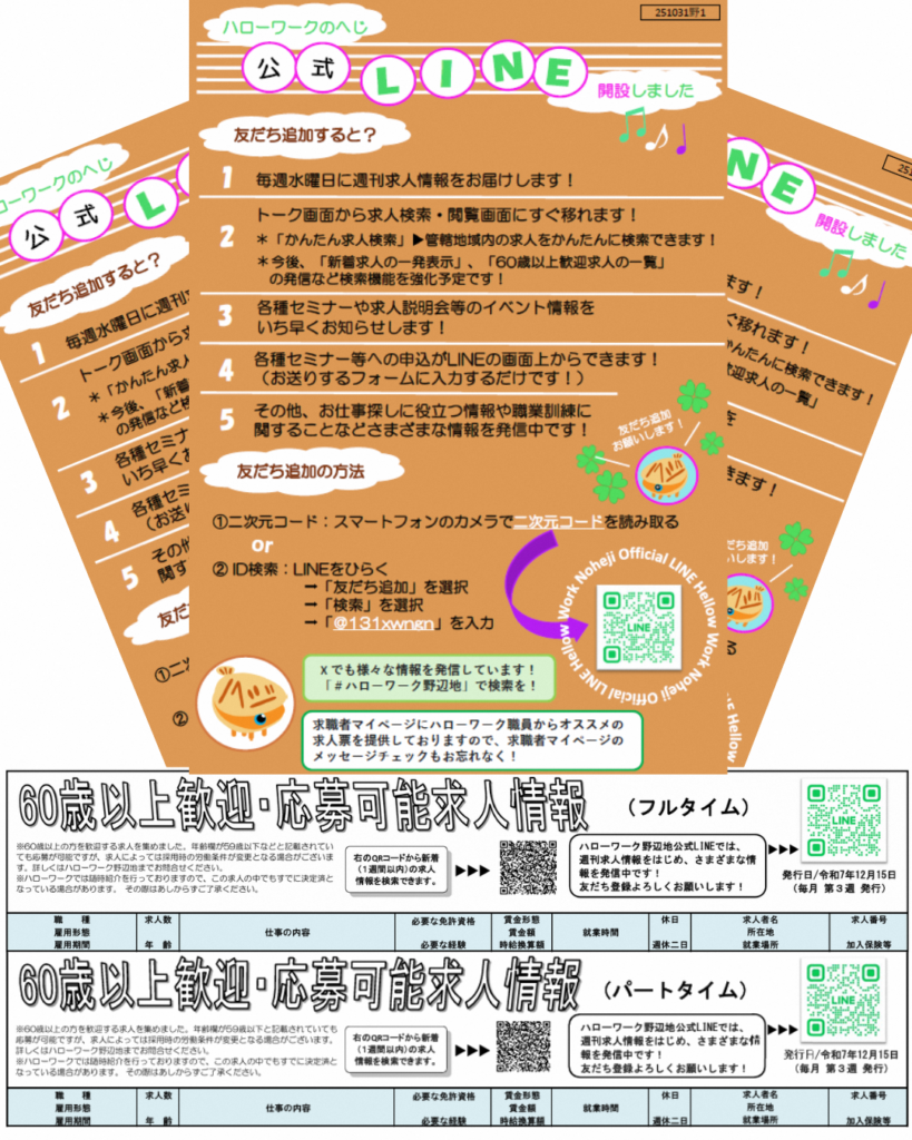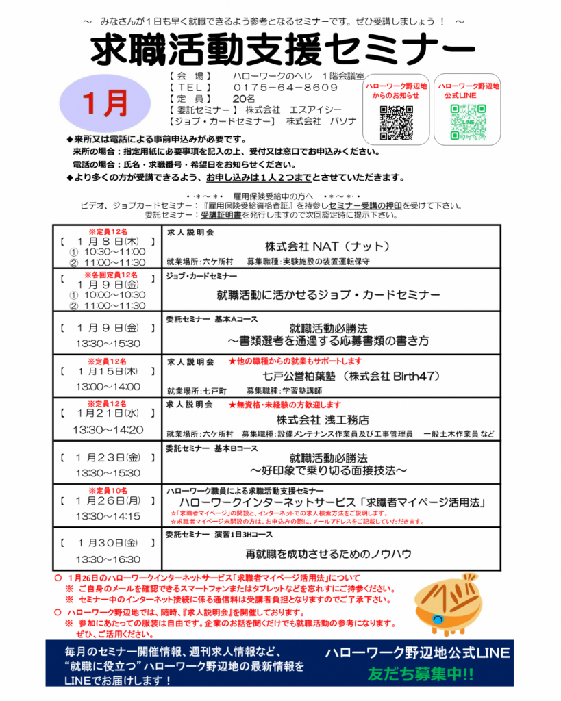 【ハローワーク野辺地】情報~求人説明会・1月分求職活動支援セミナー・公式LINE・60歳以上方向け求人情報~