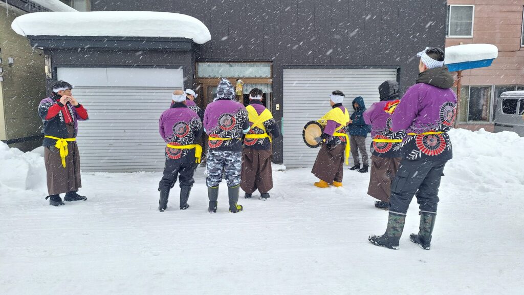 地区内の各家庭を回って行う「門打ち」。