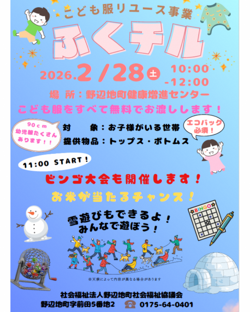 【イベント情報】 まだまだ着られる! こども服リユース事業「ふくチル」開催! 👕~2/28(土) 野辺地町増進センターにて~