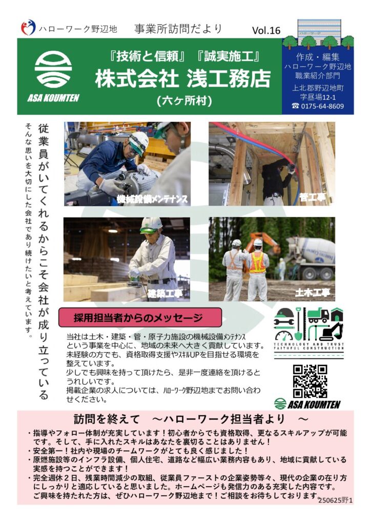 ハローワーク野辺地のご協力のもと、最新の求人・求職支援情報を発信いたします。