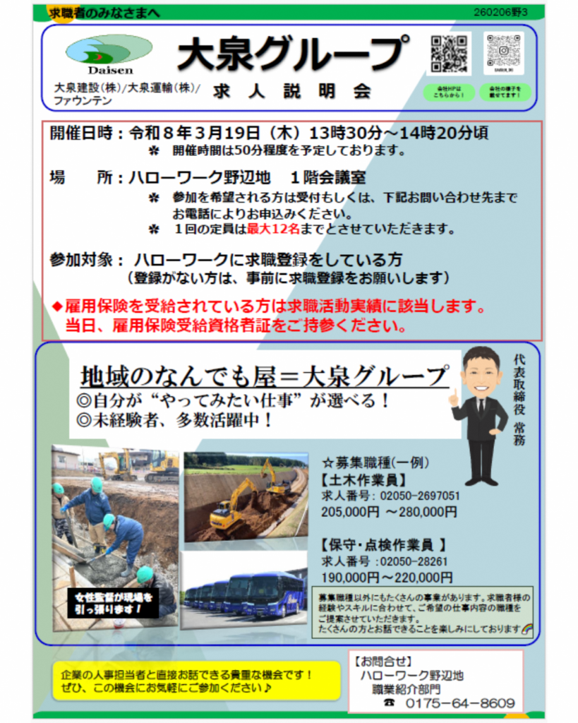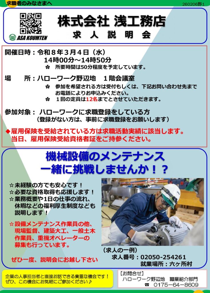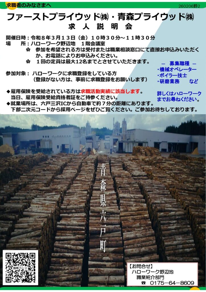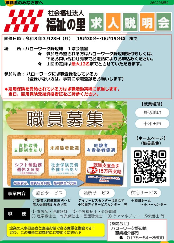 【ハローワーク野辺地】~求人説明会・事業所だより・3月求職活動支援セミナー・オンライン職業相談~