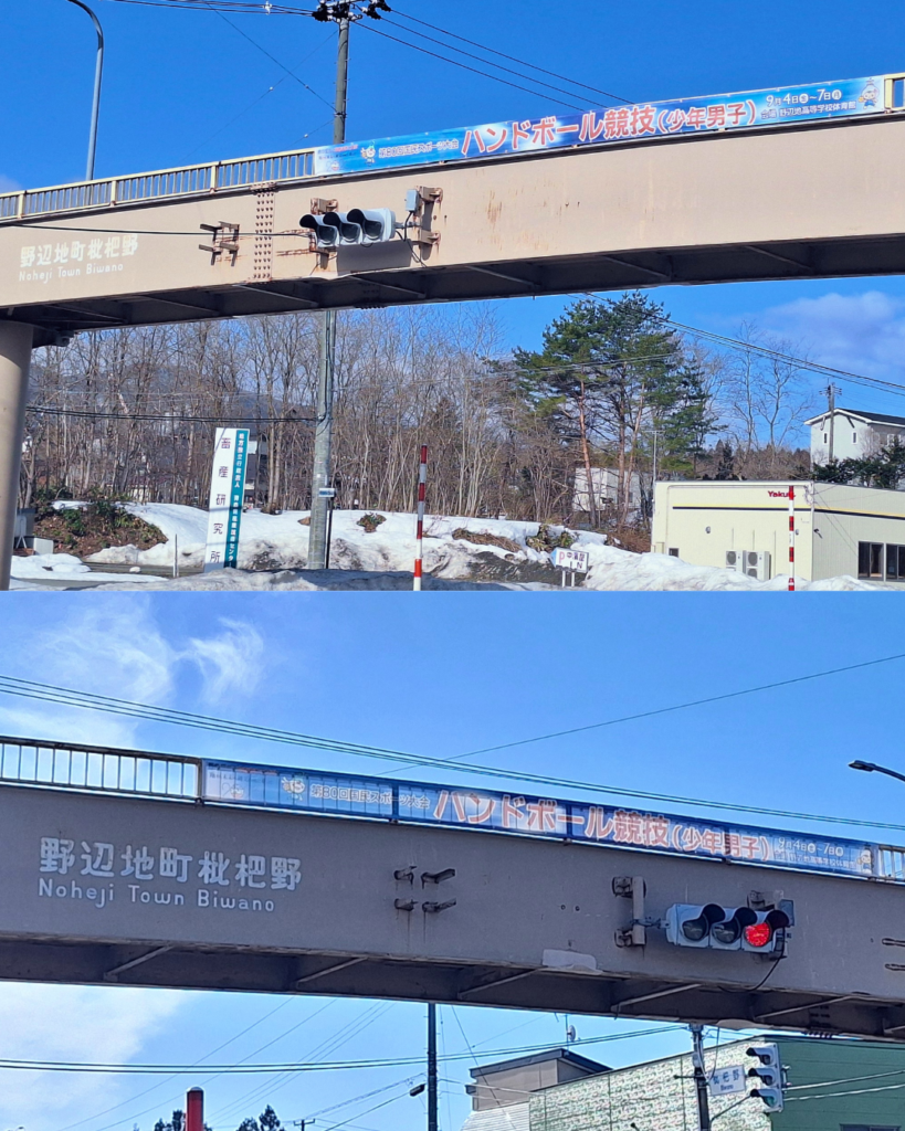 会場となる野辺地高等学校近くの野辺地枇杷野歩道橋にも新たに懸垂幕が掲げられています。