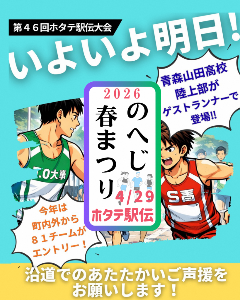仲間とタスキをつなぎ、野辺地の春を駆け抜けるホタテ駅伝大会がいよいよ明日開催となります✨